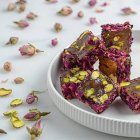 Добавьте к своему десерту украшения из лепестков фисташки.